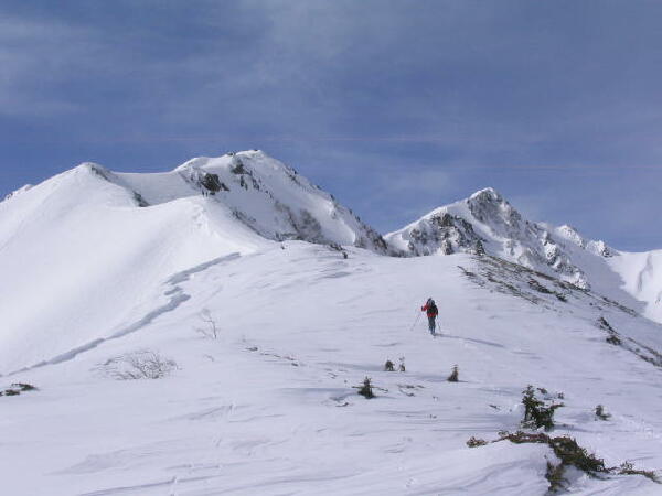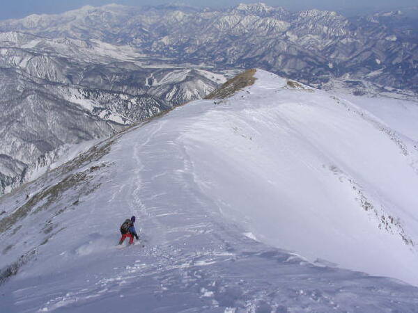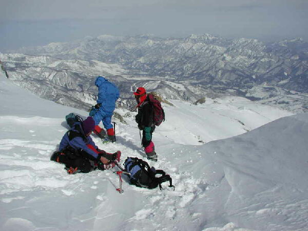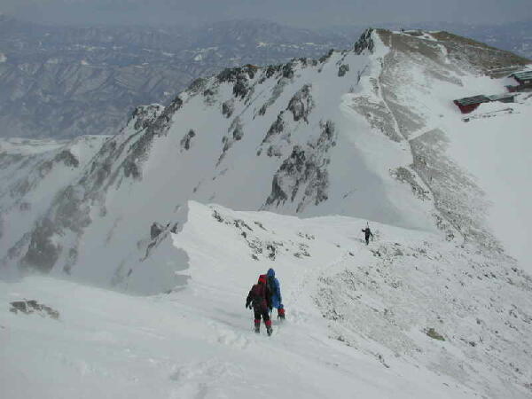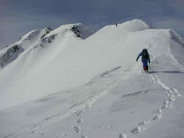 穏やかとはいえ、稜線の風は強く、よろけることしばし。前を行くのはタカノリ。雪庇はまだ小さい。