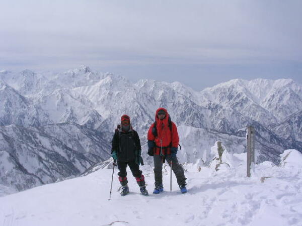 剣岳をバックに、