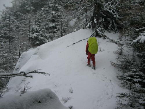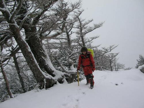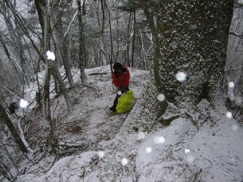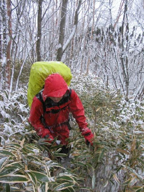 降雪の中、藪を上る |