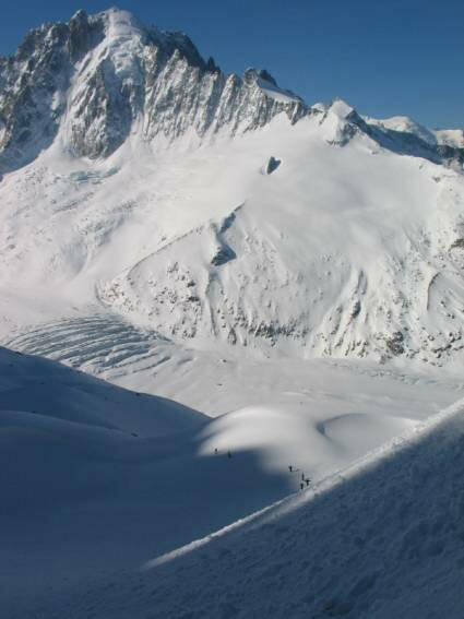 カリカリの斜面で下はアルジェンチール氷河まで一気に落ち、青黒いクレバスがパックり口を開いている。緊張す