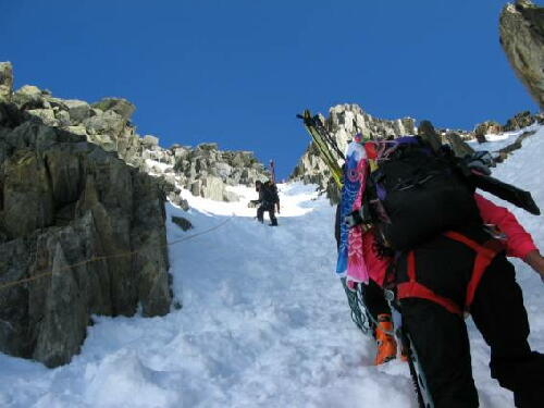 1000mのトラバースを終えコルの取り付きに着く。ここからスキーを背負ってアイゼンで上る。一応、フレッド〜
