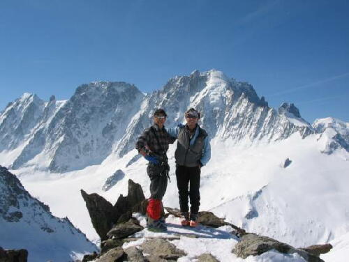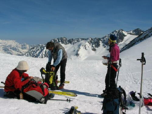 小屋前を少し歩いて下り、スキーを履く。カリカリの氷河を10分ほど滑りシール・スキーアイゼンでパッソンのコル