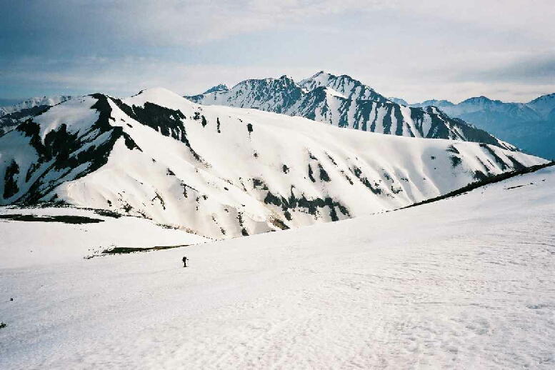 対岸の真中に太郎平小屋が確認できます。分かりますか?スキーでグングン近づく。 |