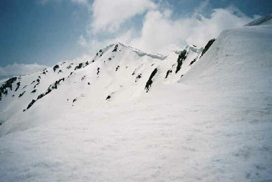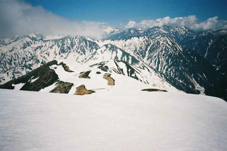 中央奥左から剣、右に龍王・鬼・獅子の尾根。その向こうに大きな立山(雄山)。切れているところがザラ峠、中央白い尾根が五色ガ原。 加藤も朝から、頑張っています。 |