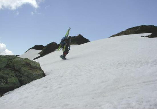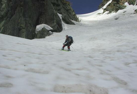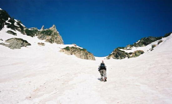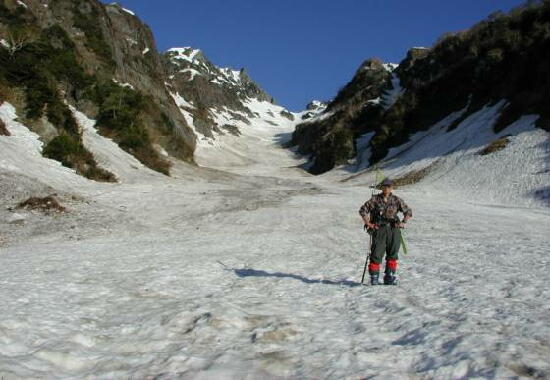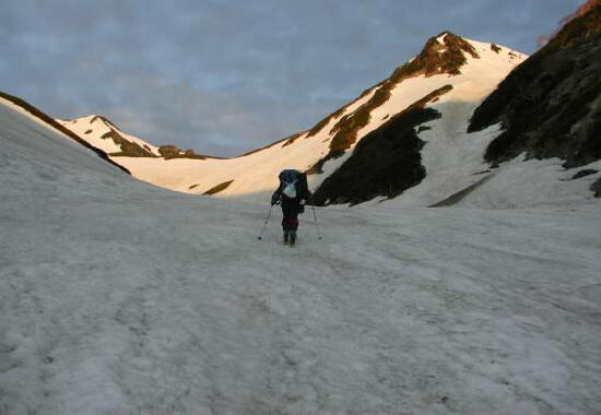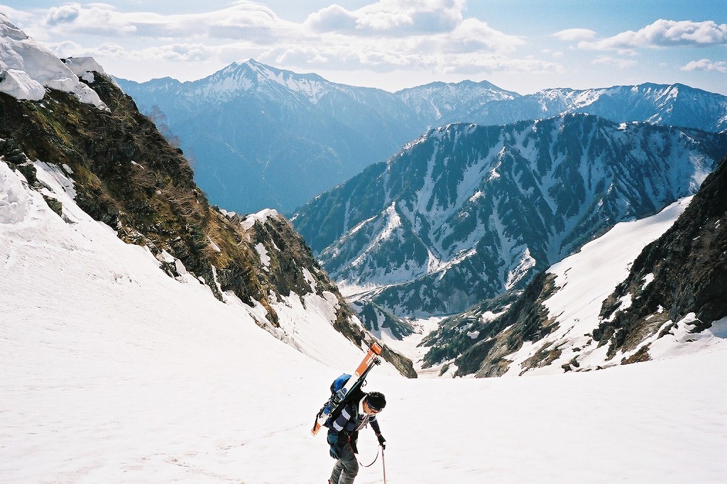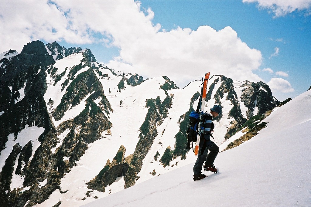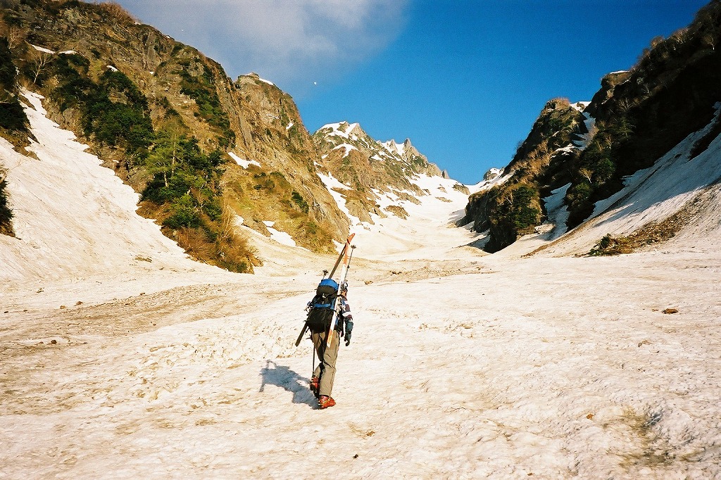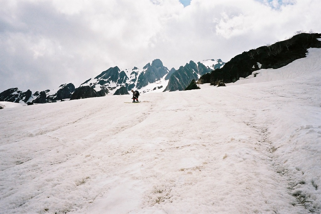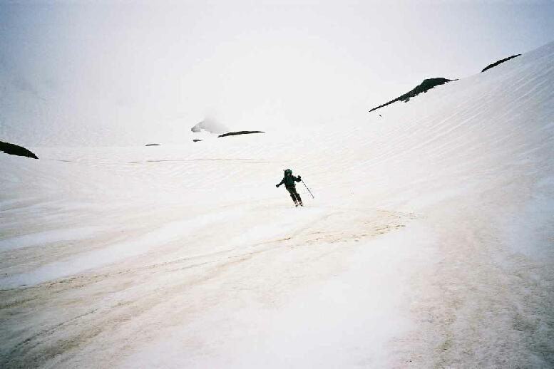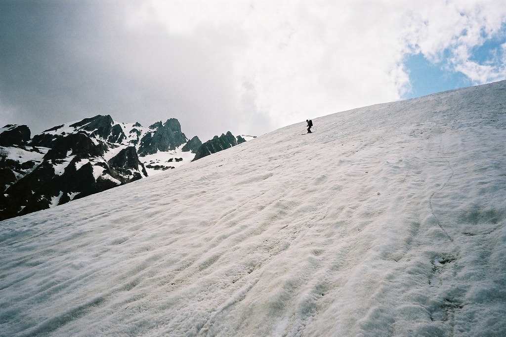 5.24(金)別山乗越を越え、まず剣沢を1000m滑る。ややガスっぽかった。途中クレバスがあった。 |