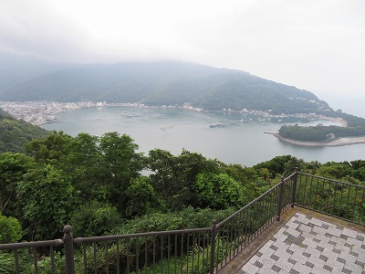 「夕映えの丘」で休憩。前回歩いた「御浜岬」を俯瞰。見事。