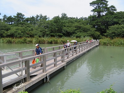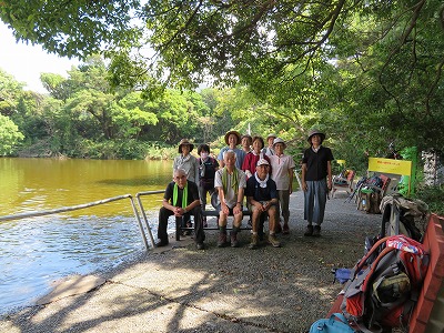 大瀬崎西海岸を歩き、神池に着いた。人懐っこいコイが大きな口を開けてワイワイとやって来る。