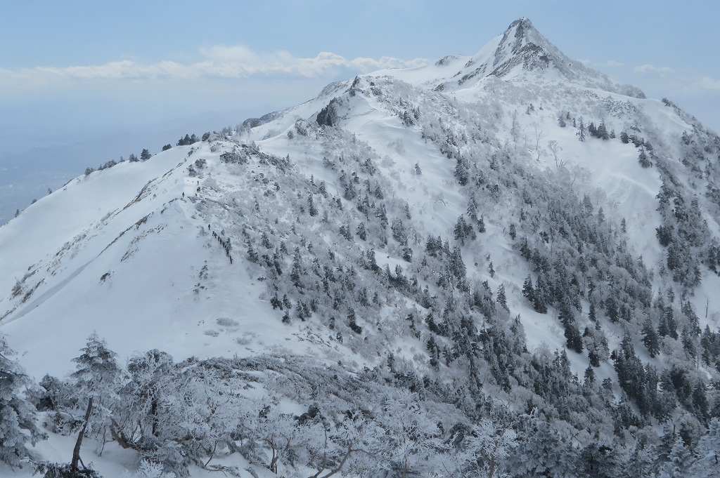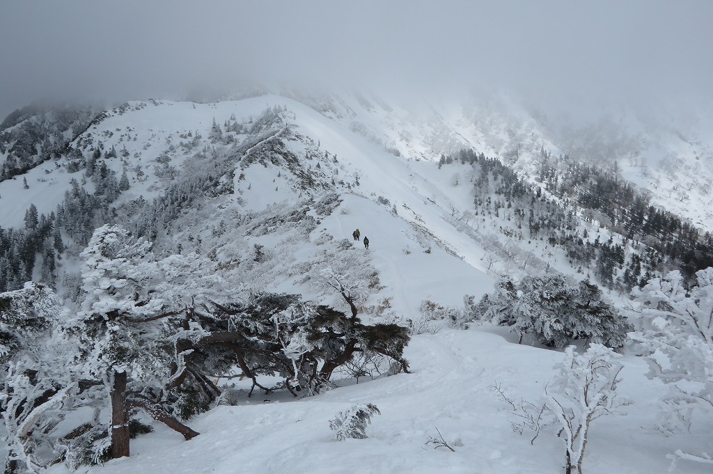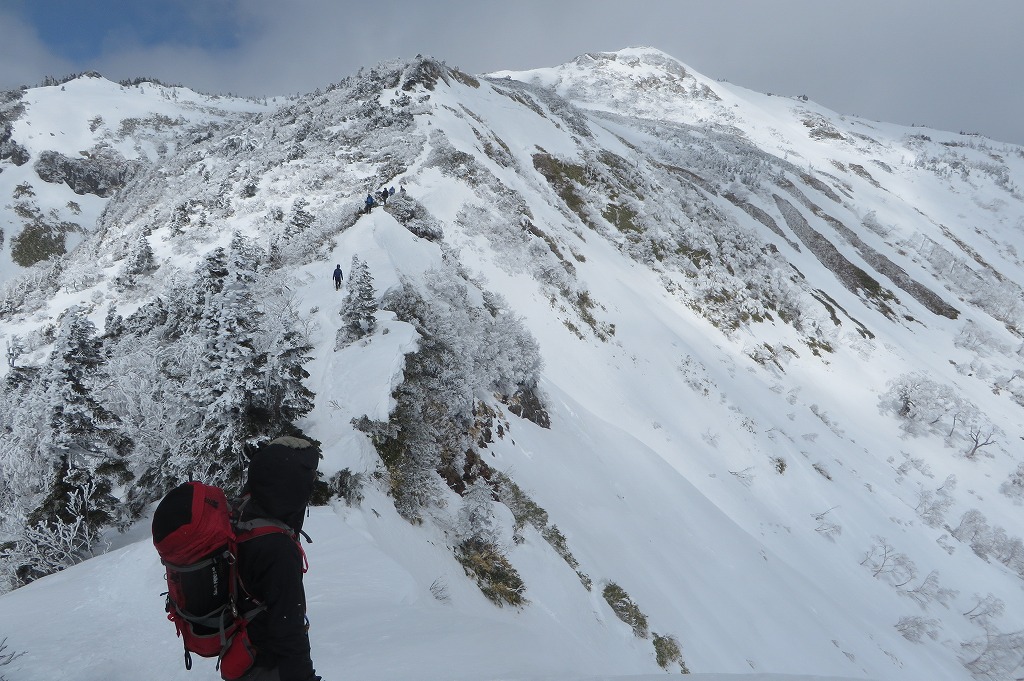 427 写真館 21日、武尊山・高手新道取り付き 尾根に出た 唯一会った登山者(昨日西黒にいた方)しかし、途中下山?? 厳しい上り 西峰下の運休中ゲレンデ 西峰(1870.5m) ここでリフト終点と合流 剣ヶ峰山 今日も冬型で天気は悪い あさぎり山の会御一行あさぎりは、リフト登山 4時間半で頂上着 ようやく武尊が見えた 剣ヶ峰山 下山は、リフトでラクチンリフト代金は、ナシにしてくれた(笑い) 左の尾根が高手新道結局、この日の武尊山登山者 100名くらいで、高手新道からは 我々2名だけだった おわり |